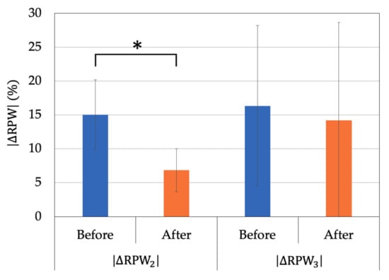 Results of before and after applying local vibratory stimulation to the muscle spindles (higher frequency). indicates the relative proprioceptive weighting ratio of muscle spindles (higher frequency), and indicates the mean value of for healthy adults (Supplemental Table S2).