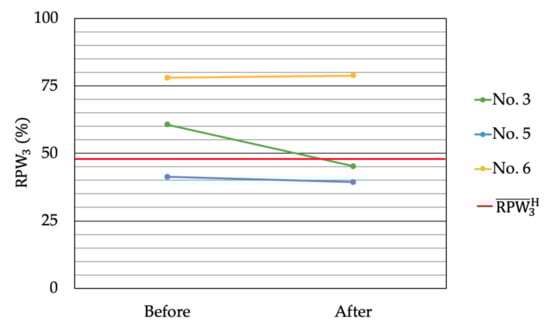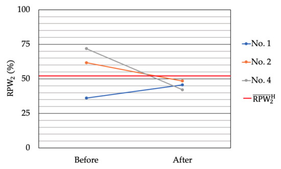 During this phase, we determined the poor proprioceptor and applied local vibratory stimulation to the determined poor proprioceptor. First, the method used to determine the poor proprioceptor is explained. The poor proprioceptors in each of the six elderly patients with NSLBP were determined based on the RPW of 60 healthy adults (Supplemental Tables S1 and S2). First, the difference between the measured value of for elderly patients with NSLBP and the mean value of for healthy adults was calculated using Equation (7).