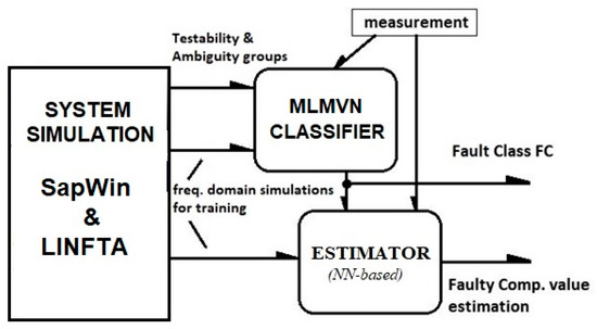 One of the first approaches for the neural network-based analog fault diagnosis was proposed by Spina and Upadhyaya [14]. They used a feedforward neural network with the error backpropagation learning algorithm. Features extracted from the circuit response to a white noise were applied to its input. The neural network approach was improved by M. Aminian and F. Aminian via data preprocessing techniques such as wavelet decomposition and principal component analysis [15,16,17]. However, these approaches have strong limitations due to the lack of a testability analysis of the problem, which is an important prerequisite to a successful fault diagnosis strategy, as recently remarked [18,19,20]. By identifying how many and which components is possible to diagnose in the event of a failure, the testability analysis also allows the definition of the maximum diagnostic performance. In fact, the testability index represents an a priori evaluation of the solvability level of the problem and allows for the identification of ambiguities that make it impossible to detect the fault.