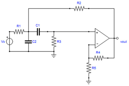 The Sallen-Key filter (SKF), shown in Figure 2, is a simple circuit with low sensitivity to the component variations, e.g., to the manufacturing tolerances. On the other hand, the low sensitivity makes it a challenging test for diagnosis, and it is also often used as a benchmark in fault diagnosis works (e.g., [22,26]). The used configuration is a bandpass centered at 25 kHz.