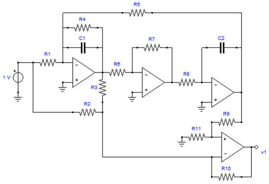 An analog biquadratic LP filter, reported in Figure 3, is taken as a second case. In the circuit, 13 elements are present which could be subject to fail (R1-R11, C1, and C2), while an ideal model is used for the operational amplifiers.