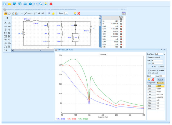 The third example is a passive network filter, largely used in the low frequency distribution system, in order to suppress (or to mitigate) the disturbs over the line caused by the nonlinear loads (in recent years, this kind of noise has increased, mainly due to the switching converters and electrical drives connected to the line) [42]. In Figure 4, a schematic of the network filter is shown together with its frequency response curves. The filter is typically installed in a three-phase system, and each single phase is taken in consideration for the measurements. The filter under exam is constituted by three groups of R-L-C impedances connected across the line, with the goal of correctly attenuating the odd order harmonics on the line (the even harmonics are much less influential, since their contribution tends to cancel). The components of the impedances have the following names and nominal values: