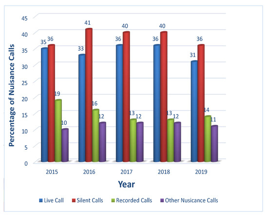 - Existing techniques are only applicable to automatically dialed prerecorded voice-spam. These mechanisms do not consider other types of unwanted nuisance calls. However, the nuisance calls statistical report presented in [31] shows that live and silent spam calls occur in a much larger quantity compared to recorded spam calls. Figure 2 shows that in 2019 alone the percentage of live and silent calls was 31% and 36%, well above the 14% of recorded calls. Live calls are generally made for telemarketing and scam purposes whereas silent calls occur in Denial-Of-Service (DoS) attacks. Accordingly, the existing spam detection mechanisms do not treat the majority of nuisance calls and need to be revised to detect other more relevant types of spam calls. Moreover, live and silent spam calls are considered to be more harmful to the users as well as to the network.