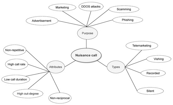 Nuisance calls are considered pollution for Internet Telephony. To effectively detect and combat nuisance calls, it is essential to first examine and understand them. In this section, we present a model to describe nuisance calls over Internet telephony. The nuisance call model is presented in Figure 3. The model incorporates three aspects of nuisance calls (i) purpose, (ii) types, and (iii) attributes. We describe the nuisance call model by discussing the classification and characteristic of nuisance calls in Section 3.1 and Section 3.2.