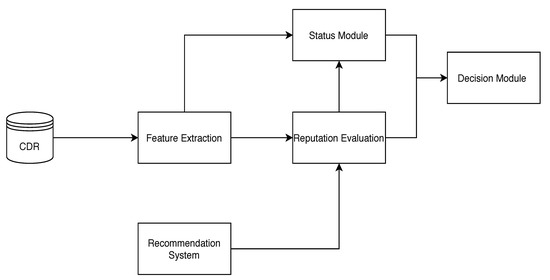 Based on these requirements we built a reputation model to detect nuisance calls. The functional architecture of the model is presented in Figure 4. The reputation model consists of five components namely, Features Module, Recommendation System, Reputation Computation, Status Module, and Decision Module. When a caller initiates a call, the signaling function is executed to route the call to the callee. In parallel to the signaling function, the caller reputation value and status are extracted from the reputation module and status module respectively. The reputation value is used to determine whether the call being initiated is legitimate or malicious. The decision module decides to reject or send the call based on the reputation value of the caller and the preferences set by the callee. The reputation value is computed based on the call features extracted by the feature module and recommendations provided by the recommendation system. The details of each component are described in the following subsections: