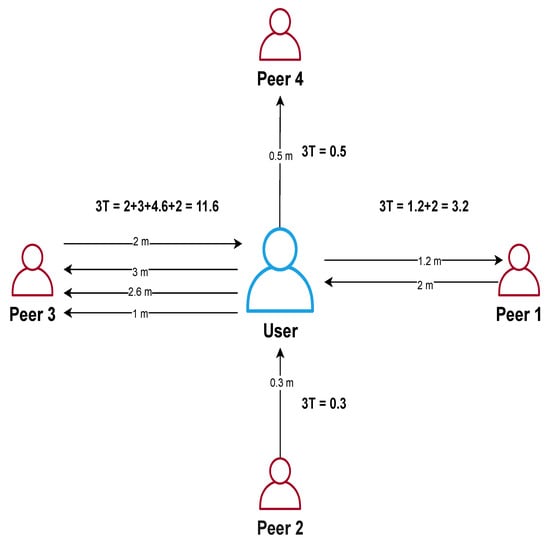 The ego network for a particular ego node consists of all nodes to whom the ego is directly connected to. The call feature module uses call data records to create an ego network of each user in the network in a particular time window. This user-specific ego network consists of a user and the entire set of peers to whom it is connected. The ego network is used to compute the Total Talk Time (3T) between two peers which is the sum of the duration of all calls made between them. An example of an ego network for communication scenario is shown in Figure 6. In this scenario, the user is connected to four other communicating participants called peer 1, 2, 3, and 4 in a particular time window. The user has a reciprocal call behavior with peer 1 and peer 3 as calls are placed in both directions. It only has a repetitive behavior with peer 3 as three calls are placed by the user. The figure further shows that the user is connected to peer 4 and peer 2 as it sends a call to peer 4 and receives a call from peer 2. The ego network is used to compute for a user with each of its communicating participants. The maximum value of the depends upon the time window selected. In the example the time window is 20 min therefore the maximum value of will be 20. The with peer 1, peer 2, peer 3, and peer 4 are 3.2, 0.3, 0.5, and 11.6 respectively. From the figure, it can be observed that the user has repetitive and reciprocal behavior with peer 3. Thus, the value of incorporates the reciprocal and repetitive nature of calls placed between them. The higher reciprocal and repetitive behavior is reflected by a higher value of . A high value between two peers can indicate a high trust relationship. Additionally, the call feature module computes also the out-degree of each user, as the number of peers to whom the user has placed the call. In the ego network of Figure 6, the user out-degree is 3, as the user has called peer 1, 3, and 4. A high out-degree together with a short indicates that the caller is not very popular among the network and is most likely spamming in the network.