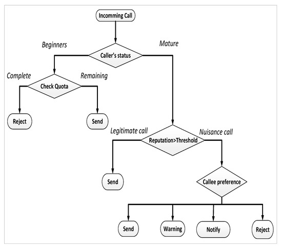 The decision module is responsible for processing all call requests. It extracts information from different modules and determines whether a call is legitimate or a nuisance. The flow diagram of the decision module is shown in Figure 7. When a call request is received, the decision module extracts the caller and callee identity from the call request. Then it checks the status of the caller from the status module. If the caller is a Beginner it examines the call quota of the caller. If it is within the quota, the call request is sent to the callee. If the Beginner has already consumed its quota the call request is rejected. If it is a Mature user the reputation module is used to extract the reputation of the user. Using a certain threshold set by the service provider the incoming call is categorized into legitimate and nuisance call as follows: