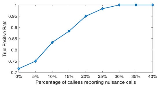 In this experiment, we show how recommendations influence caller reputation, which further helps to identify malicious callers in the network. We use the True Positive Rate to show the number of malicious callers correctly identified in the network. This includes telemarketers, autodialers, and attackers. Correct identification will help the decision module to combat nuisance calls generated in the network. Figure 8 presents True Positive Rate for the percentage of callees reporting nuisance calls in the network. It can be observed that the True Positive Rate improves with the increased percent of callees reporting nuisance calls. This shows that with a high amount of recommendations there is a better chance to identify malicious callers correctly. This is because recommendations decrease the overall reputation of the malicious caller. The decrease in the reputation of malicious callers allows them to be detected more easily. Moreover, the credibility factor allows false recommendations to be weighted less as compared to trustworthy recommendations. Figure 8 reveals that if at least 30 percent of the callees start recommending in the network, the True positive rate goes to 1. This means that service providers need to encourage more callees to report nuisance calls. The service provider may provide incentives to encourage their subscriber to report nuisance calls.