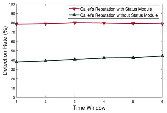This experiment shows the effectiveness of the status module to stop whitewashing attacks. The Detection Rate is used, representing the percentage of nuisance calls detected in the network. Figure 10 compares the performance of caller reputation used with and without the status module in terms of Detection Rate. In this experiment, we consider of the malicious callers performing whitewashing attacks to clear their bad reputation and start afresh to generate nuisance calls. We selected , live telemarketers, autodialers, and attackers that perform whitewashing. The status module can prevent malicious callers from generating nuisance calls when they re-enter the network. Figure 10 shows that when using the status module the Detection Rate increases significantly. The status module is effective in acting as a deterrent against whitewashing attacks by removing its advantages. If a malicious caller changes identity it has to earn a respectable reputation again before it can start generating further nuisance calls in the network. Thus, it has to act legitimately in the network for a while. This reduces the number of nuisance calls that are placed, and those that go undetected in the network. Without a status module, a malicious caller may attain a new identity at zero cost. If detected, a malicious caller can re-enter the network under a new identity. With the new identity, the malicious caller would attain a neutral reputation which would allow it to instantly start generating nuisance calls in the network. The nuisance calls generated would go undetected for a long period until the reputation of the caller drops below the threshold. This results in a low detection rate of around . On the other hand, with the status module, the detection rate goes higher to around .