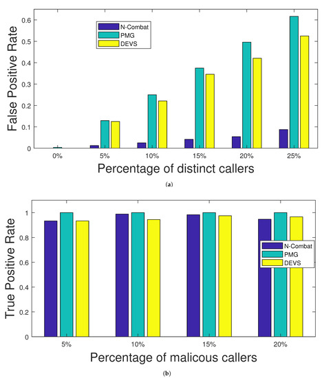 In this experiment, we compare caller reputation with threshold-based voice spam combating techniques. We implemented two of the popular spam detection solutions: PMG and DEVS. Both solutions detect spam based on different call attributes and a pre-defined threshold. PMG determines a grey level for the spammer using call density. If the grey level of a caller reaches a certain threshold, calls made by this caller are blocked. DEVS is largely based on call duration and number of call recipients, using a decision threshold to decide whether a caller is a spam caller or not. For further details on PMG and DEVS implementation please refer to [14,28] respectively. In order to compare the performance, we use False Negative Rate and False Positive Rate as shown in Figure 11. Figure 11a presents the False Positive Rate against the percentage of distinct callers present in the network. Distinct callers are legitimate callers with call patterns similar to spammers, thus are the best candidates for false positives. From Figure 11a it can be observed that caller reputation outperforms PMG and DEVS in terms of false positive rate. Even with 25% distinct callers present in the network, the False Positive Rate for caller reputation is below 0.1. On the other hand, PMG and DEVS are unable to detect distinct callers and thus have a high False Positive Rate. With 25% distinct callers the False Positive Rate is above 0.5. This leads to a high number of legitimate calls falsely detected as nuisance calls which are damaging to the reputation of the service provider. This shows that the existing techniques such as PMG and DEVS do not have any mechanisms to avoid false detection of nuisance calls which is one of the major limitation identified in Section 2. Figure 11b shows the True Positive Rate against the percentage of malicious callers present in the network. From the figure, it can be observed that all three solutions have almost the same true positive rate. With 20% malicious caller present in the network, all three have a true positive rate of above 0.9. Thus, we can conclude that caller reputation is a compatible solution in terms of True Positive Rate while it performs exceptionally well in terms of False Positive Rate when compared to DEVS and PMG.