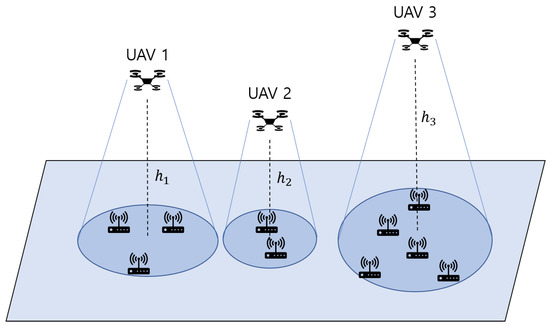 Unmanned aerial vehicle (UAV)-assisted communications have gained widespread attention for their contribution toward human convenience and efficient line-of-sight (LoS) links [1] from the air to the ground. In addition, in various fields, such as agriculture and logistics, the use of UAVs is popular and common, and virtually essential [2,3]. Therefore, extensive research on UAV communications in wireless systems has been carried out recently to serve mobile users in complex urban areas as well as remote locations, where terrestrial communication is extremely difficult. This issue is more critical in Internet of Things (IoT) systems because IoT devices are typically limited to small battery capacities and therefore, are used in short-distance communication [4,5]. Additionally, lightweight IoT devices are deployed to collect field information in the cases of natural disasters and other emergency situations [6,7,8,9,10]. The utilization of UAVs to assist such IoT systems with the narrowband-IoT (NB-IoT) technology is a novel solution [11,12].