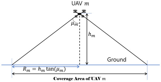 As shown in Figure 2, denotes the radius of the coverage area of the UAV m, and it can be calculated by the beamwidth that is received from the UAV’s antenna as follows: