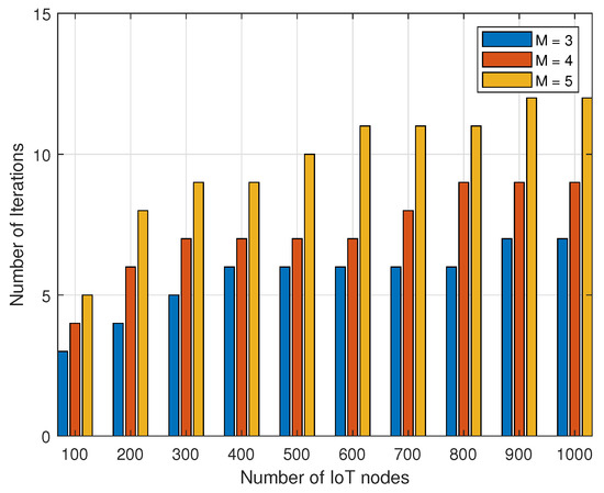 With the Stackelberg game theoretic approach, the number of iterations to achieve the suboptimal convergence is shown in Figure 4. The actual number of iterations of the algorithm demonstrates that the algorithm can achieve a suboptimal clustering solution after a finite number of iterations. The simulation result is obtained by setting and setting the number of IoT nodes from to , that is from a small environment to a large environment. The detailed description of the simulation setup is provided in Section 4. As shown in the Figure 4, the number of iterations required for the convergence of the total throughput of the system increases according to the number of UAVs and IoT nodes. However, the number of UAVs has little effect on the number of iterations when compared to the number of IoT nodes. In addition, the number of iterations converges when , regardless of the number of UAVs. The evaluation was performed 100 times for each distribution of the IoT nodes, and then the results were averaged. The evaluated results show that the proposed algorithm can obtain suboptimal results within 10 iterations, even with a large number of IoT nodes.
