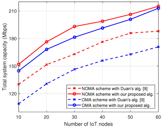 Additionally, the total system capacity was compared with that of another relevant scheme proposed in [15]. Duan et al. [15] applied non-orthogonal multiple access (NOMA) technology to increase the total system capacity through competitive resource allocation and UAV placement. This model uses a method of allocating subchannels within the cluster through M:N matching. At this time, each channel creates a preference list for IoT devices based on the channel gain, and subchannels are allocated to IoT device according to the created preference list. They then conducted a performance comparison between the OMA and the NOMA schemes. For comparison with this model, the experimental setup was established and the proposed algorithm was applied to the OMA scheme and the Stackeblerg game theoretic approach-based clustering algorithm was applied to the NOMA scheme, as depicted in Figure 5. The results demonstrate that the proposed algorithm improves the overall performance of Duan’s scheme as well as the performance of the OMA scheme by applying the joint clustering and subchannel allocation algorithm when compared to the original NOMA scheme. In particular, the performance of the NOMA and OMA schemes were improved by approximately 17.0% and 28.3%, respectively.
