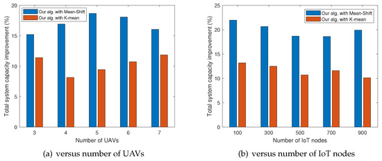 Figure 6 shows the improvement in the total capacity for the mean-shift clustering method and the K-mean clustering method with the application of the proposed algorithm. Figure 6a shows that the number of UAVs set, was changed from to , and Figure 6b shows that the number of IoT nodes set, was changed from to in the field. This result shows that the proposed algorithm has improved the performance of the traditional clustering method by approximately 28%. That is, the proposed algorithm can be applied to existing infrastructure to increase the efficiency of the capacity. A higher improvement ratio was observed when the result was applied to the mean-shift method when compared to the K-mean method. Therefore, the proposed algorithm improves performance regardless of the basic clustering algorithm.