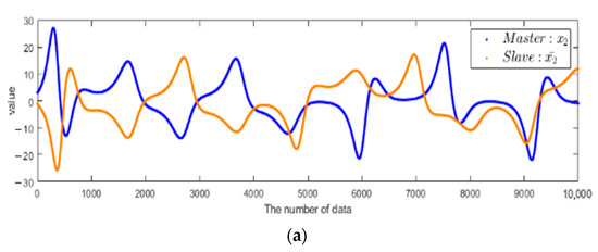 In the Lü system, , , and affect each other, and thus, we employ the PD controller in one of the states of the chaotic system for synchronization. In this study, we control the second states, and , of the systems. Figure 3 shows the states and of the master and slave before the application of the PD controller; the error falls between −40 and 60.