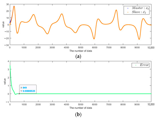 After the optimized parameters are obtained, the second states, and , of the master and slave, respectively, are found to be successfully synchronized, with an error of less than at approximately 649 iterations. Figure 6 shows diagrams of the second states of the master and slave with the PD controller as well as their errors.