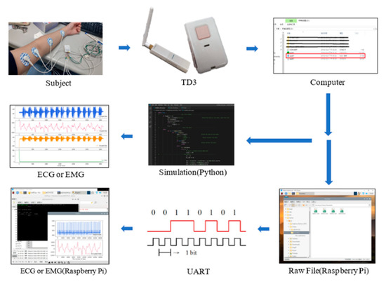 First, we collect the biomedical information, ECG or EMG bio-signals, from the subjects with a wireless multi-channel physiological signal recording system (TD3, GPU123 Technology Co., Ltd., Taoyuan, Taiwan). Then, the raw data are sent to a computer via a USB wireless receiver. In the following, a simulation part and an implementation part will be discussed. The architecture of the system is shown in Figure 9.