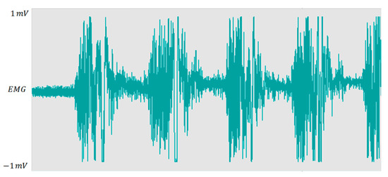 In case of EMG, the bio-signal sensor patches are attached to the biceps of the left arm. In the test, we start from the arm in a free-fall state (0°) to the arm perpendicular to the body (90°), lifting approximately 2 kg of object every four seconds, as shown in Figure 12. The test lasts for 62 s with 31,136 data points, with a maximum amplitude of approximately 2 mV, as shown in Figure 13.