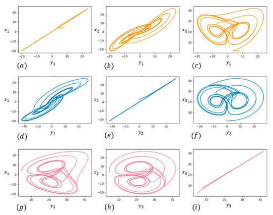 Simulation of the attractors. (a) x1 to y1; (b) x2 to y1; (c) x3 to y1; (d) x1 to y2; (e) x2 to y2; (f) x3 to y2; (g) x1 to y3; (h) x2 to y3; (i) x3 to y3.