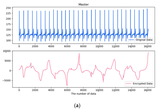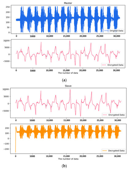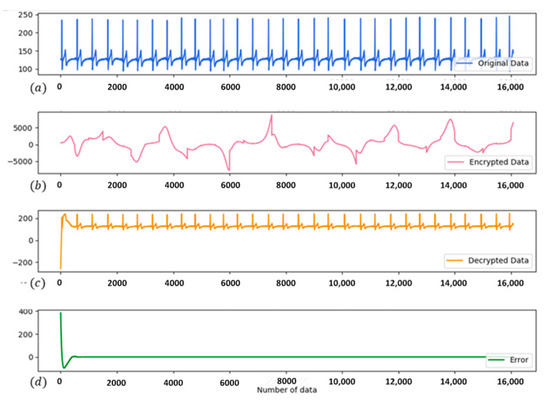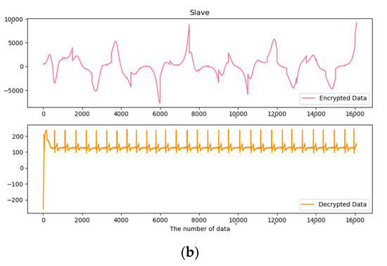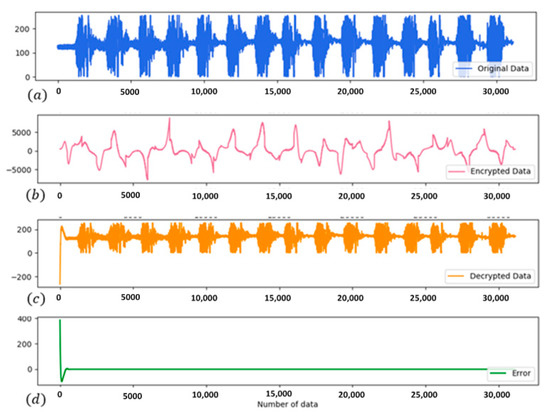 The third column shows that except for the part with a large error at the beginning, the plot is the same as that obtained from the original bio-signals after encryption and decryption; thus, we can confirm the completion of system synchronization and the accuracy of encryption and decryption.