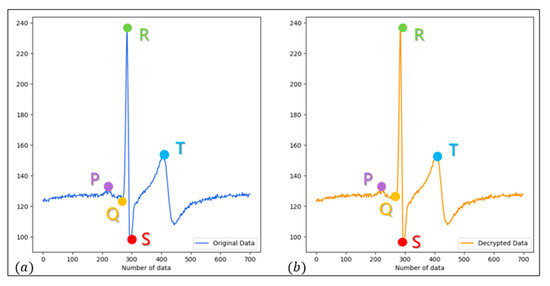 To confirm the data accuracy, the data of one wave are taken for verification. As shown in Figure 17, the waves remain the same before encryption and after decryption. Thus, we can confirm the completion of system synchronization and the accuracy of encryption and decryption with ECG.
