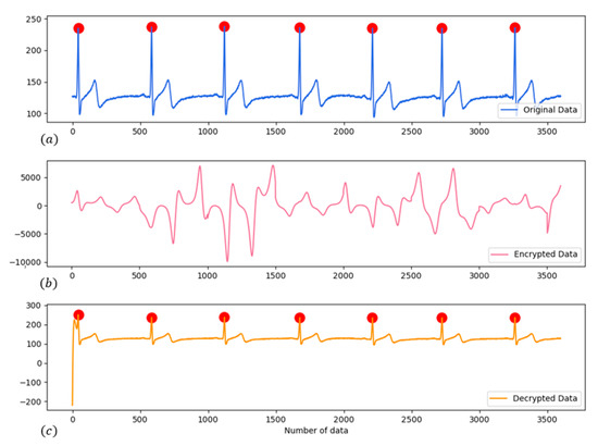 Simulation of heart rate. (a) The original data; (b) Encrypted data; (c) Decrypted data.