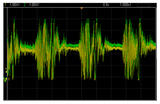 Figure 24 shows the EMG before encryption in the master and after decryption in the slave. The maximum and minimum values of the bio-signals are 0 and 5 V, respectively, and the unit is 1 V/cell. Figure 25 shows the ECG before encryption in the Master and after decryption in the Slave. The maximum and minimum bio-signals are 2 V and 4.5 V, respectively, with unit of 1 V/cell. The figure indicates that the bio-signals before encryption and after decryption remain the same, except for the offset misalignment of the error.