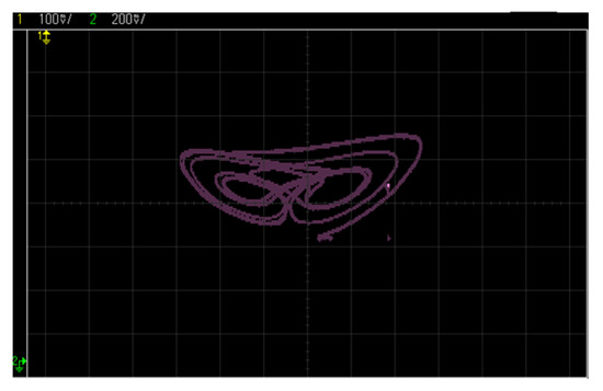 As mentioned previously in Figure 14, we take one state from each chaotic system, and as a result, draw the same attractors from the master and slave. Here, we follow the steps shown in Figure 16 and take and from the master and slave, respectively. Then, the result is displayed on an oscilloscope, as shown in Figure 26.