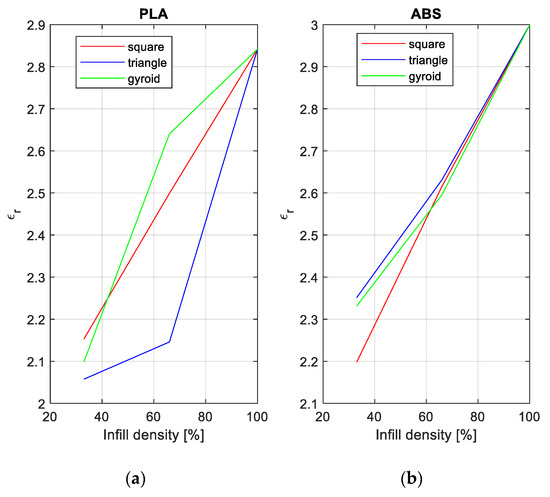 From Figure 3, it can be seen that the relative dielectric constant increases with the increasing infill density, regardless of the infill pattern. Therefore, it can be observed that the infill pattern is a function of the relative dielectric constant. Furthermore, PLA is more sensitive to changes in patterns than ABS, which can be concluded due to the better focus of three lines in Figure 3b than in Figure 3a.