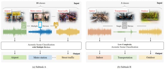 Figure 1a shows the problem overview on subtask A. Subtask A aims to classify audio into ten classes. Related audio files are recorded or simulated using multiple devices. The development dataset includes 40 h of data from device A and smaller amounts of data from other devices. The audio is provided in a single-channel 44.1 kHz 24-bit format. Figure 1b shows the problem overview on subtask B.