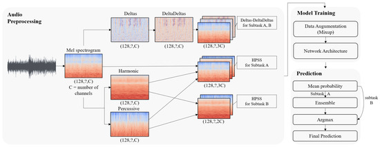 Most top teams of 2019 used CNNs for audio data. We applied CNNs on preprocessed features (log-mel-spectrogram, deltas, delta-deltas, and HPSS). Figure 2 illustrates our architecture. Subtasks A and B are similar; however, we avoid ensembles in subtask B to maintain a lightweight model. In the following sections, we describe the network architectures for subtasks A and B.
