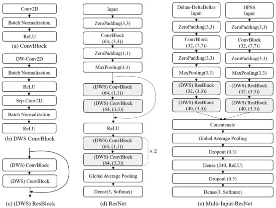 Moreover, we considered the multi-input model shown in (e); two input features are HPSS and deltas-deltadeltas. Each input had its own convolutional layers to extract the features, which were then concatenated and fed to the subsequent fully connected layers. First, the HPSS and deltas-deltadeltas features are trained through each layer composed of ConvBlock (a) and ResBlock (c), and after the concatenation of the two layers, they pass through the Global Average Pooling layer. The fully connected layer was not used for model efficiency.