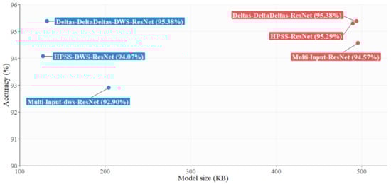 Table 4 and Figure 5 present the experimental results for subtask B. Deltas-DeltaDeltas-ResNet, HPSS-ResNet, and Multi-Input-ResNet in Table 4 indicate the accuracy and model size of reduced ResNet and multi-input models without DWS in the convolution layer. The ResNet model performance using the Deltas-DeltaDeltas feature was the highest at 95.38%. As the model weight reduction technique was not used, the model size is smaller than the 500 KB limit in the competition, but its size is close to the limit. Deltas-DeltaDeltas-DWS-ResNet, HPSS-DWS-ResNet and Multi-Input-DWS-ResNet indicate the results of the models based on the model weight reduction technique (DWS convolution). Overall, the performance of the models with DWS has slightly decreased, but we can see that the model size is more than three times smaller with DWS convolutions.