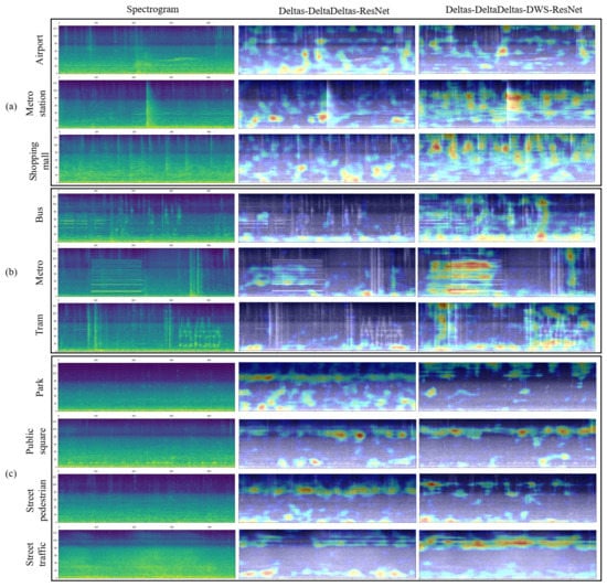 Ren et al. [30] visualized the attention layer of the model to explain the result. Wu and Lee [31] also visualized the Grad-CAM results for metro stations, residential areas, and trains for the 2017 ASC competition data. A shown in Figure 6, the visualization results for train and metro stations were similar to those of other studies. We additionally found in our study that the background sound of an outdoor environment can be observed as a horizontal line of fixed frequency.