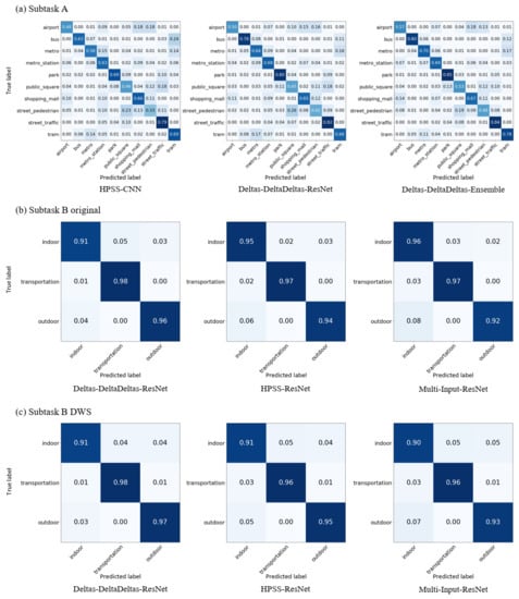 Figure 7a is the confusion matrix for HPSS-CNN, Deltas-DeltaDeltas-ResNet, and Deltas-DeltaDeltas-Ensemble of Table 2 for subtask A. When Deltas-DeltaDeltas-ResNet was used, the problem of misclassifying Bus as Tram was reduced compared with the case of HPSS-CNN, and the accuracy in the case of Bus significantly improved; the problem of misclassifying Park as Public Square or Tram was also reduced. In addition, as a result of using Deltas-DeltaDeltas-Ensemble, it was possible to reduce the problem of misclassifying Public Square as Street Traffic or misclassifying Street Pedestrian as Public Square, which was not resolved in Deltas-DeltaDeltas-ResNet.