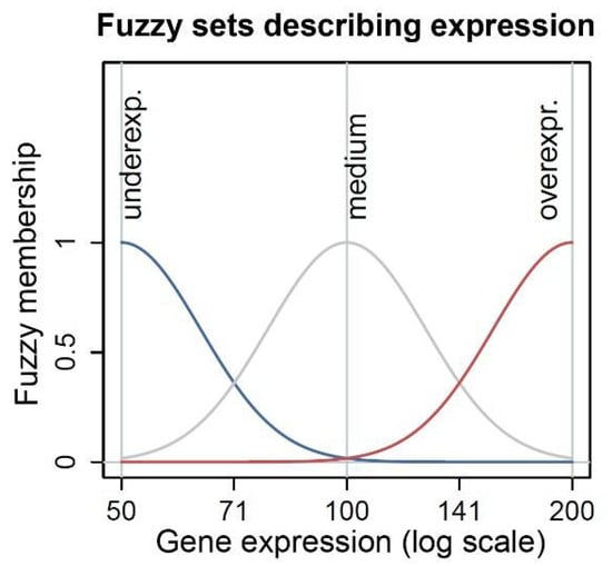 The classifier was implemented with the “frbs” R package []. As the aim of the work was to analyze the gene expression variations, the input variables are the genes selected through the GA. As variations are usually considered to be high (overexpression) or low (underexpression), we have defined the number of fuzzy terms for each gene domain as three (low, medium, and high expression). The medium expression fuzzy set is centered on the mean expression of the gene. The fuzzy rules are equidistant Gaussian sets, and the extreme sets have their center defined by the most extreme values of their gene domain. As domain experts are interested in observing the fold change rate, to linearly represent the increase and decrease of expression (for example, a halving or doubling of expression), we have defined the fuzzy sets on a logarithmic transformation of the estimated expressions, as shown in Figure 1.