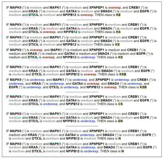 Figure 2 shows an example of a set of rules defined by one of the final 72 individuals. As mentioned above, the final individuals all contain XPNPEP1, GATA4, DTX3L, and NPIPB12 and a different combination of the other genes. Moreover, all the final individuals exhibit a similar structure to the final rules. In particular: