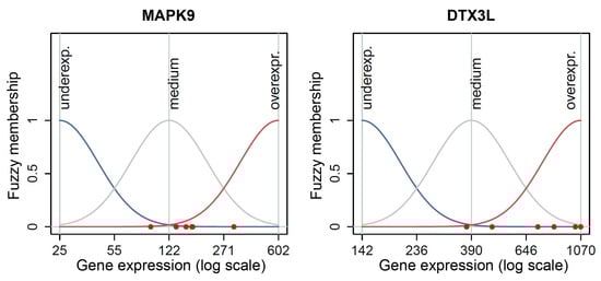 The fuzzy sets defined over the gene expression of MAPK9 and DTX3L for the KS samples.