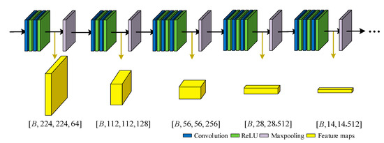 We extracted the features through the pre-trained VGGNet-16, which is shown in Figure 3. The convolutional layer output before the maximum pooling layer is the feature graph, which was used for subsequent information measurement [27]. In the source image, the underexposed image has lower brightness. Therefore, the overexposed image contains more texture details or greater gradients than the underexposed image. The shallow features such as texture and details were extracted from and , and the deep features such as structural content were extracted from the feature maps of the later layers.