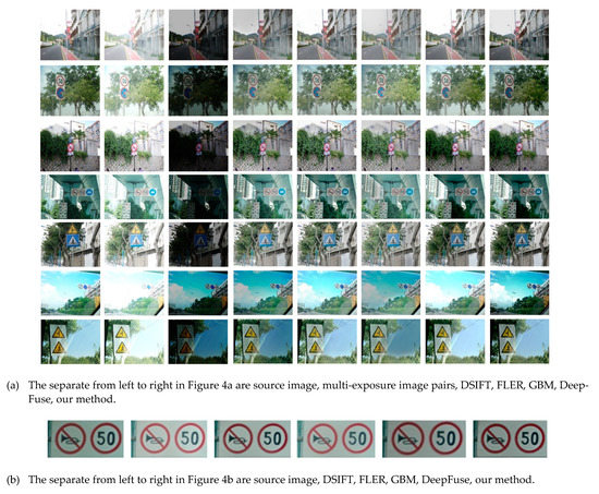 We also placed an enlarged view of the road signs in one of the experimental results in Figure 4b. It can be seen that our method can retain the road sign information as much as possible. It can be seen from the results of GBM and DSIFT that their information is a bit vague, and it is not suitable for intelligent transportation systems and smart cities that require precise identification of road signs. The signpost information in our method is clearest, and the exposure level seems to be the most appropriate.