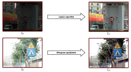The fusion result should be a normal exposure under ideal conditions, which can reflect the road sign information. However, due to the limited training set and the small number of individual road signs, the exposure of the fusion result will still not reach the normal level. Therefore, we utilized histogram equalization and Laplacian to optimize the image with a poor fusion effect.