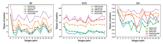 Quantitative comparisons of the SF, STD, and EN on 16 image pairs from our dataset.