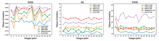 Quantitative comparisons of the SSIM, MI, and PSNR on 16 image pairs from our dataset.