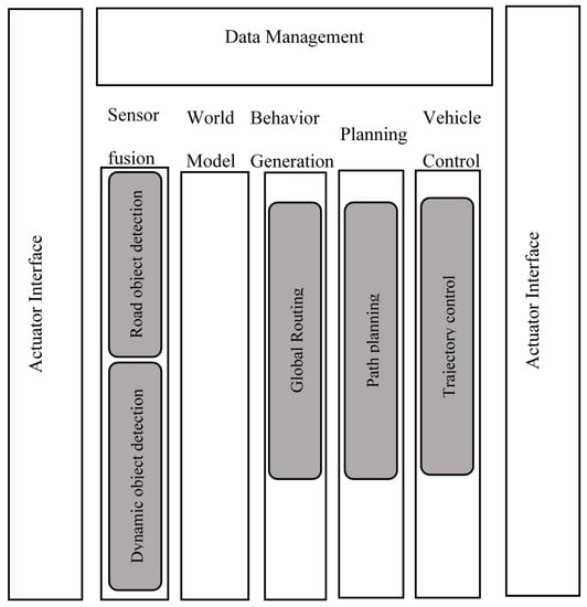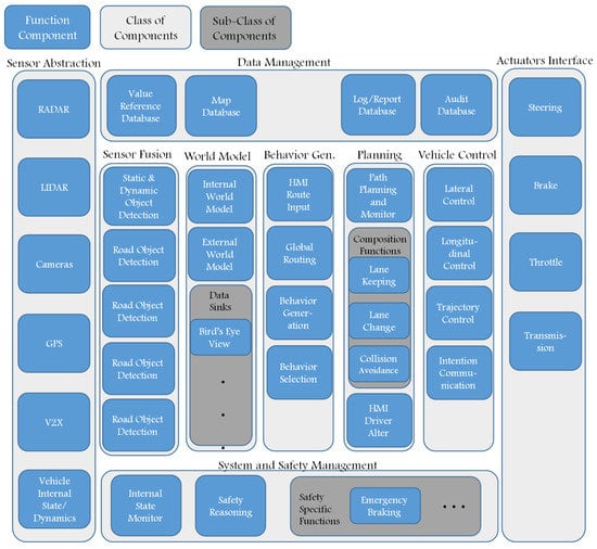 - Serban, A.C.; Poll, E.; Visser, J. A standard driven software architecture for fully autonomous vehicles. In Proceedings of the 2018 IEEE International Conference on Software Architecture Companion (ICSA-C), Seattle, WA, USA, 30 April–4 May 2018; pp. 120–127. [Google Scholar]