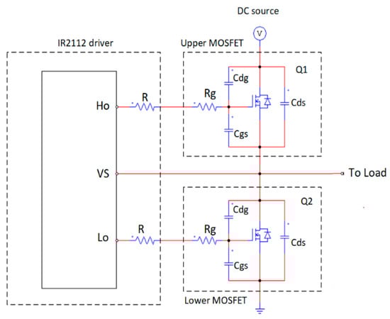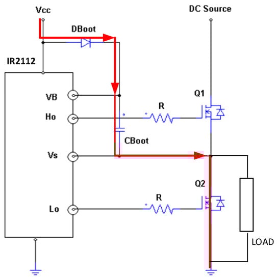 Figure 2 shows the circuit diagram of the half-bridge circuit with driver IR2112, which drives the power transistors. This integrated circuit has a high-performance and high voltage driver for power switches with two independent channels for high side and low side output. By adding an external bootstrap capacitor (CBOOT) and bootstrap diode (DBOOT), the driver provides a high switching speed [34]. The High Side Floating Voltage (VS) of the IR2112 driver is already connected to the output via the upper transistor source (Q1). When the low side channel (LO) is turned ON, the lower MOSFET (Q2) will be ON, and the high side (HO) turned OFF, the upper MOSFET (Q1) will be OFF. In this case, the VS pin will get connected to the ground via a lower transistor (Q2). The CBOOT capacitor starts charging up via the DBOOT from the VCC source, as shown in Figure 3. [35]. The highest voltage charges from CBOOT are dependent on the voltage value of the VCC source. The equivalent schematic of the MOSFET parasitic components in a half-bridge circuit is shown in Figure 4.