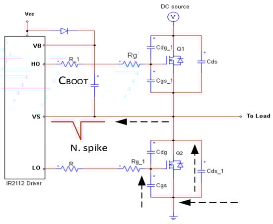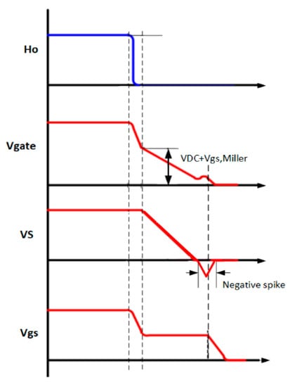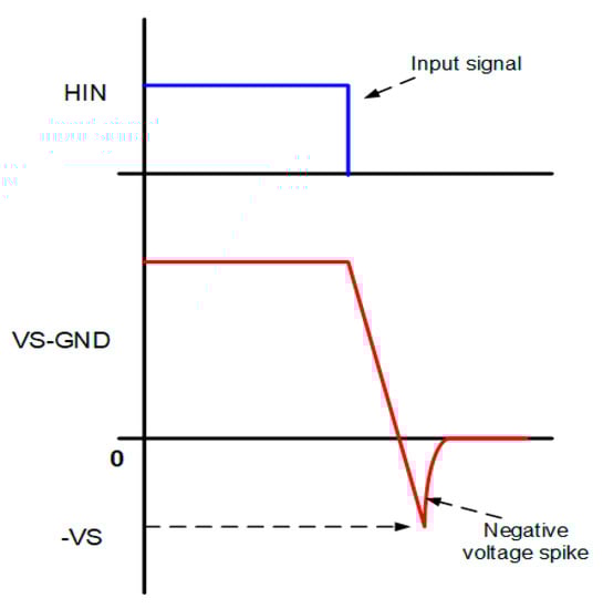 This circuit’s biggest issue is the negative voltage spike existent at the switching device source during the OFF state that causes load current flow suddenly in the low-side freewheeling diode. This negative spike can defect the gate driver’s output because it directly affects the source VS pin of the driver or PWM control IC and might pull some of the internal circuitry significantly below ground, as shown in Figure 5. The other problem caused by the negative voltage transient is developing an over-voltage condition across the bootstrap capacitor. Given the fast-rising drain-source voltage, the parasitic capacitances of a MOSFET cause a negative voltage spike during switching transitions and may result in spurious turn-on if it exceeds the threshold voltage. When the upper MOSFET turns ON, the current flow between the drain and source leads to induce the parasitic capacitor Cdg in the lower MOSFET, and it will motivate the gate-source capacitor Cgs to charge up. Therefore, it will push up the lower MOSFET’s gate voltage and generate a positive pseudo pulse. On the other side, when the lower MOSFET is turned ON, and the upper switch is turned OFF, a negative pseudo voltage will generate between the lower MOSFET gate and source, as shown in Figure 6 [36].