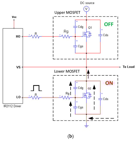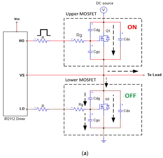 (a) Turned ON state of the upper MOSFET. (b) Turned OFF state of the upper MOSFET.