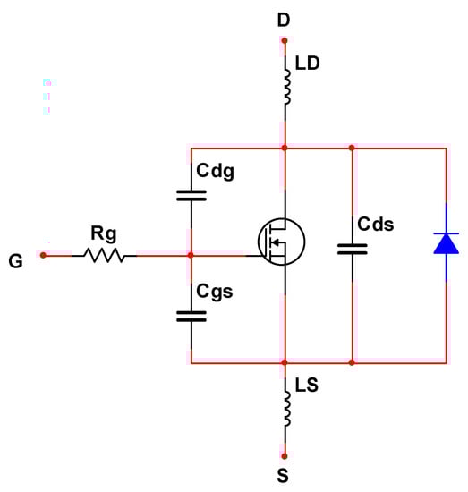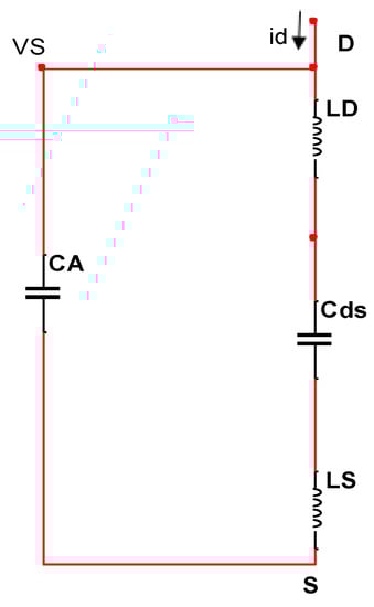 To give the mathematical modeling of the voltage spikes and oscillation conditions, the turn off process of the MOSFET has been analyzed depending on Figure 9. An ideal MOSFET transistor consists of a gate-drain capacitance (Cgd), drain-source capacitance (Cds), gate-source capacitance (Cgs), and internal diode with the parasitic inductance (LD, LS). However, Rg is the gate driver resistance. During turn-off condition of the MOSFET, Cgs capacitance starts discharge via Rg resistance, leading to decreased gate-source voltage Vgs.