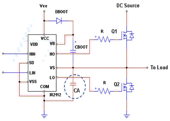 To tackle the issue of a negative voltage spike, a new capacitor CA is added to the driver IR2112 between VS-pin and the ground to absorb these spikes effectively, as shown in Figure 10. This capacitor’s main objective is to suppress the negative voltage spike, which appears at VS pin of IR2112, to improve the output voltage signal’s quality and reduce voltage spikes.